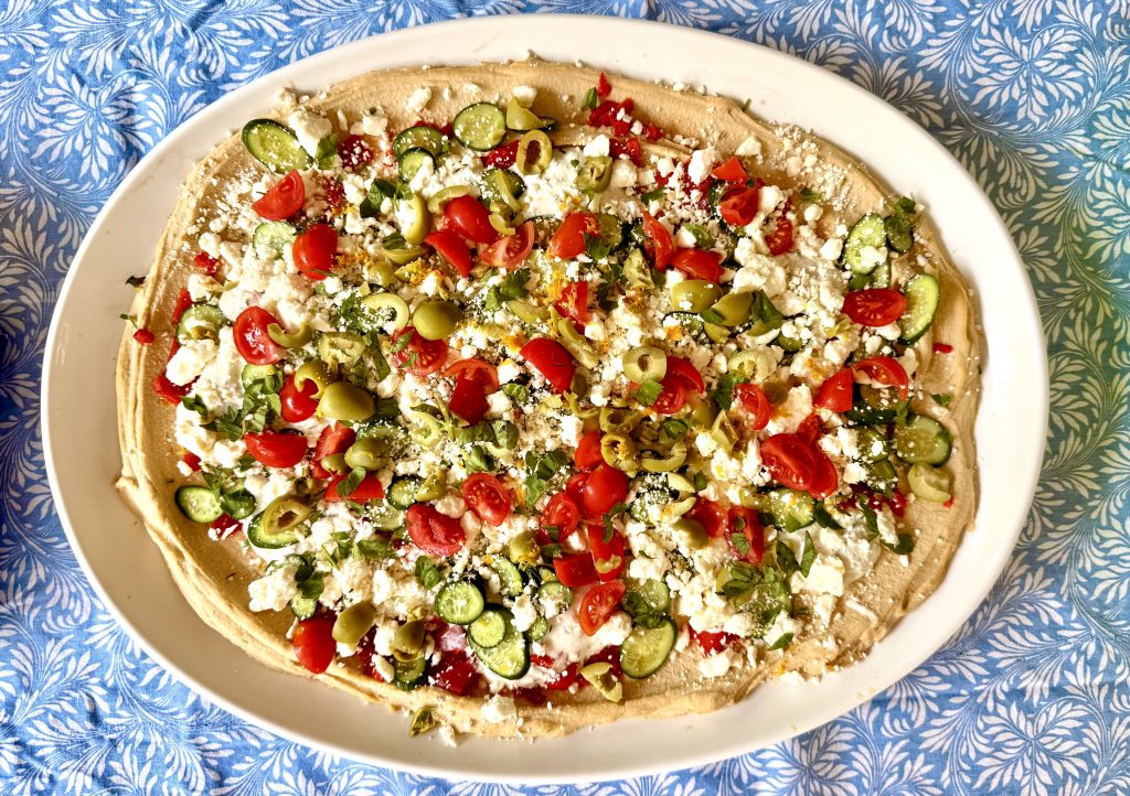 - On a large, flat platter, spread the hummus in an even layer up to the edges.